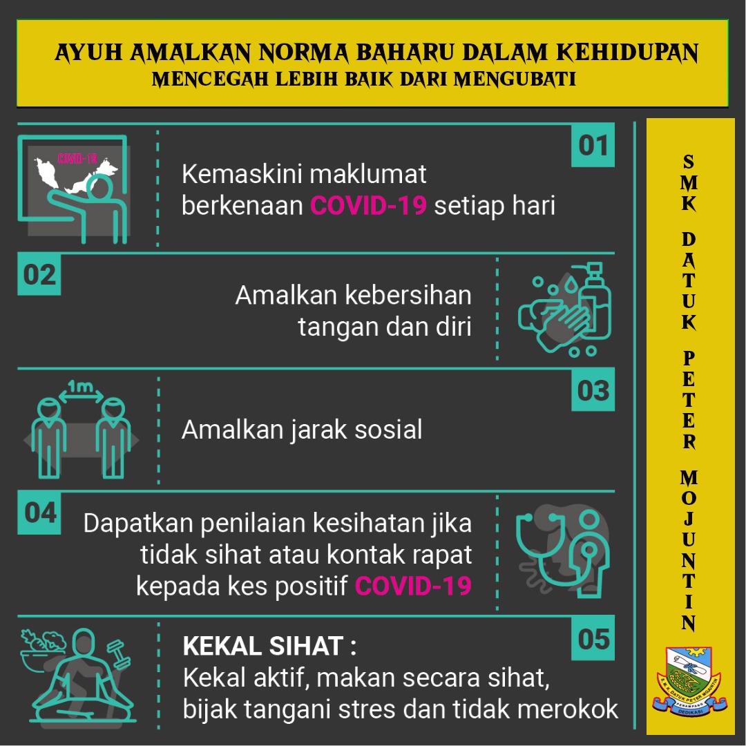 Murid-murid tingkatan 5 adalah dinasihatkan untuk mematuhi norma baharu ke sekolah. Berikut adalah panduan yang perlu dilakukan sebelum, semasa dan selepas persekolahan.